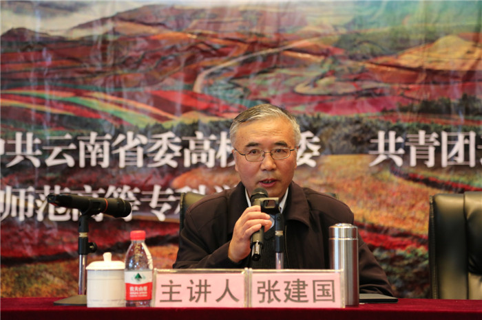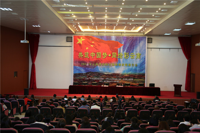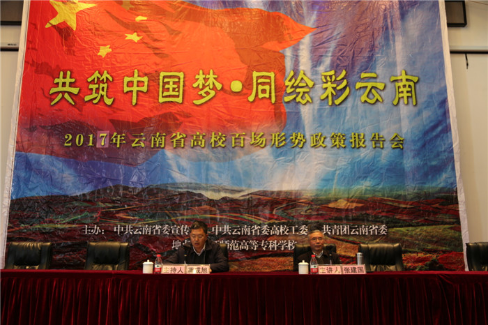 3月31日下午2:30,我校“共筑中国梦•同绘彩云南”2017年云南省高校百场形势政策报告会在学校图书馆报告厅举行。根据省高工委的通知要求,为认真学习贯彻《省第十次党代会精神》,本次报告会学校邀请了省委宣讲团成员、云南民族大学张建国教授到校进行宣讲。全校教职工党员、思政部非党教师和各系学生代表400余人参会,会议由党委书记蒋成旭主持。