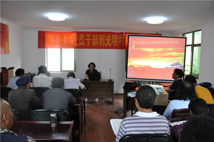 在光明村委会,学校机关党总支书记沈紫拉副教授作了题为《坚定理想信念,发挥模范作用》的党课,从“理想信念”、“中国共产党的纲领”、“最高纲领和最低纲领的辩证关系”、“全面建成小康社会”、“如何发挥先锋模范带头作用”四方面进行了深入透彻的讲解,为参会党员上了一堂精彩的党课。