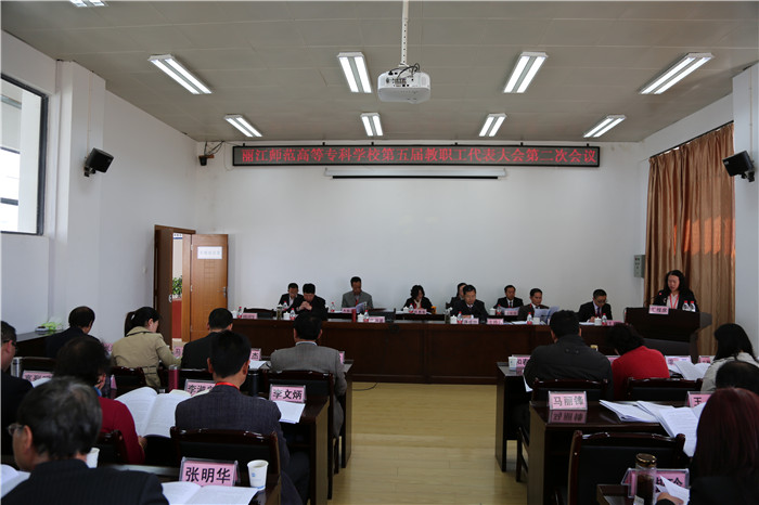 上午9:30,教职工代表大会在国歌声中隆重开幕。会议由校党委书记蒋成旭主持,校长张洪波作《学校工作报告》,副校长朱桂香作《丽江师范高等专科学校2016年度财务预算执行情况和2017年度财务预算方案报告》(草案)。