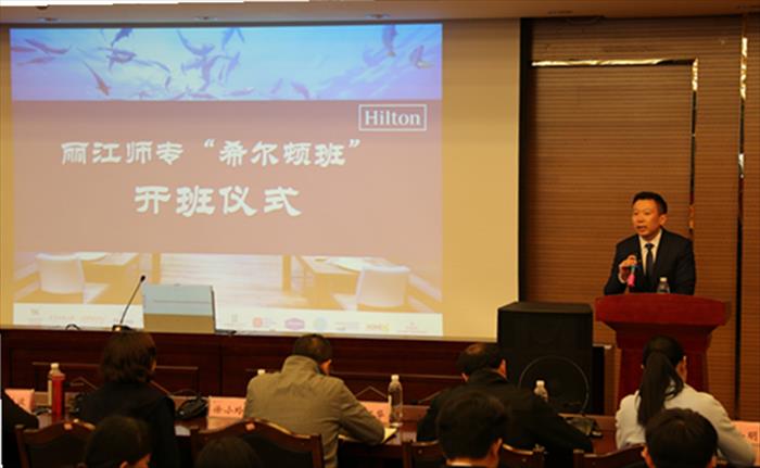 丽江师专校长张洪波代表学校致辞,张校长对王珏副总经理一行的到来表示了热烈的欢迎,张校长表示,这次校企联合,对搭建校企合作平台,深化校企合作,促进学生就业起到了积极的推动作用。张校长指出,希尔顿集团与丽江师专在酒店行业人才培养方面有着共同的目标,深化合作正是贯彻落实国家确定的“以企业为主体,市场为导向,产学研相结合”技术创新体系的重要行动。希望校企双方通力合作、互利共赢,加快推进实现酒店行业高端人才培养目标的建设步伐,为地区酒店和旅游业的发展做出更大的贡献。
