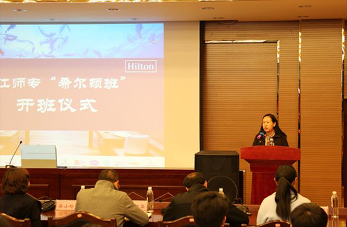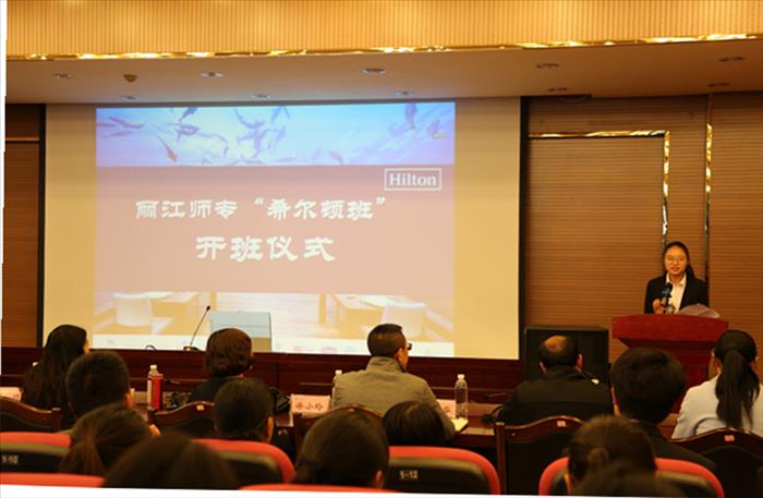 2018年3月16日下午14:00,在丽江师专实训楼318会议室,首届丽江师专“希尔顿订单班”开班仪式隆重举行,会议由丽江师专国际旅游与工商管理学院院长杨小明主持,丽江师范高等专科学校校长张洪波、丽江希尔顿花园酒店副总经理王珏、大理实力希尔顿酒店人力资源经理徐小玲、丽江师范高等专科学校教务处处长王石华、丽江师范高等专科学校招就处处长和赵涵、丽江师范高等专科学校学生处处长沈欢、丽江师范高等专科学校宣传部部长皮婧、丽江师范高等专科学校国际旅游与工商管理学院组织员王成、丽江师范高等专科学校国际旅游与工商管理学院副院长和燕杰、丽江师范高等专科学校国际旅游与工商管理学院副院长和根吉等相关领导与54名“订单班”同学出席了本次开班仪式。