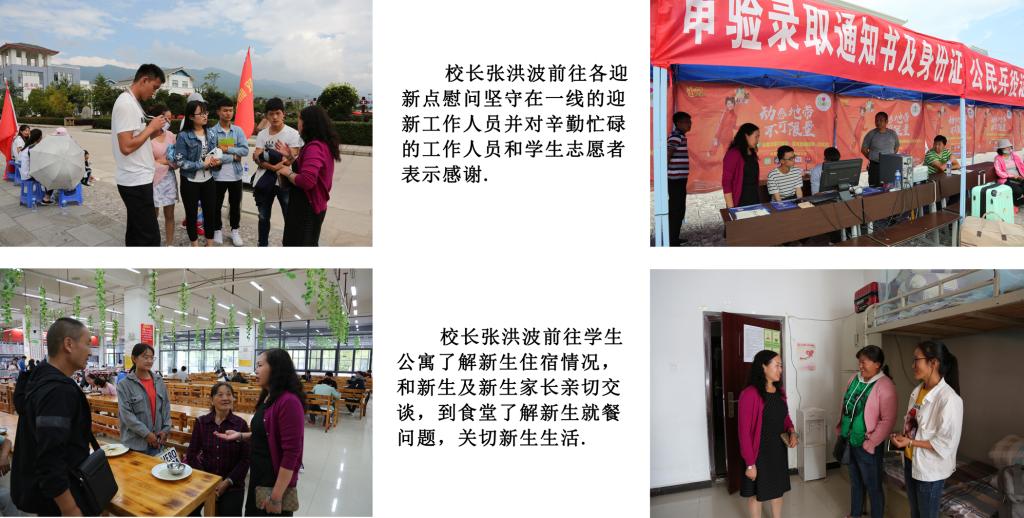 校长张洪波前往各迎新点慰问坚守在一线的迎新工作人员并对辛勤忙碌的工作人员和学生志愿者表示感谢,此外,她还到学生公寓了解新生住宿情况,和新生及新生家长亲切交谈,到食堂了解新生就餐问题,关切新生生活,并勉励他们确定目标、明确方向,脚踏实地、努力学习,将来回馈家长,回馈祖国。