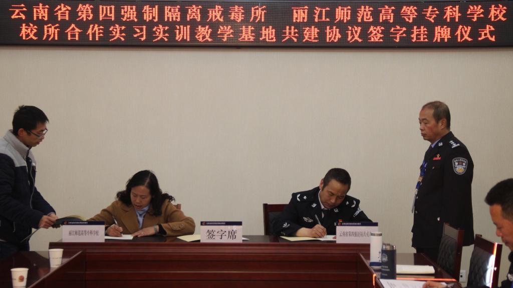 2019年1月3日上午,我校与云南省第四强制隔离戒毒所签订校外实习实训教学基地共建协议签约式在云南省第四强制隔离戒毒所举行。云南省第四强制隔离戒毒所所长周益武及相关处室领导、我校校长张洪波、国际旅游与工商管理学院杨小明、东巴艺术学院潘宏义、足球运动职业学院王晗云、应用技术学院马国发、思想政治理论课教学部张玉琴、教务处刘中旭和学生处李艳婷等参加了签约仪式。云南省第四强制隔离戒毒所所长周益武主持签约仪式。