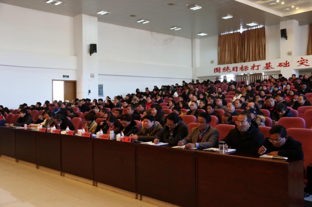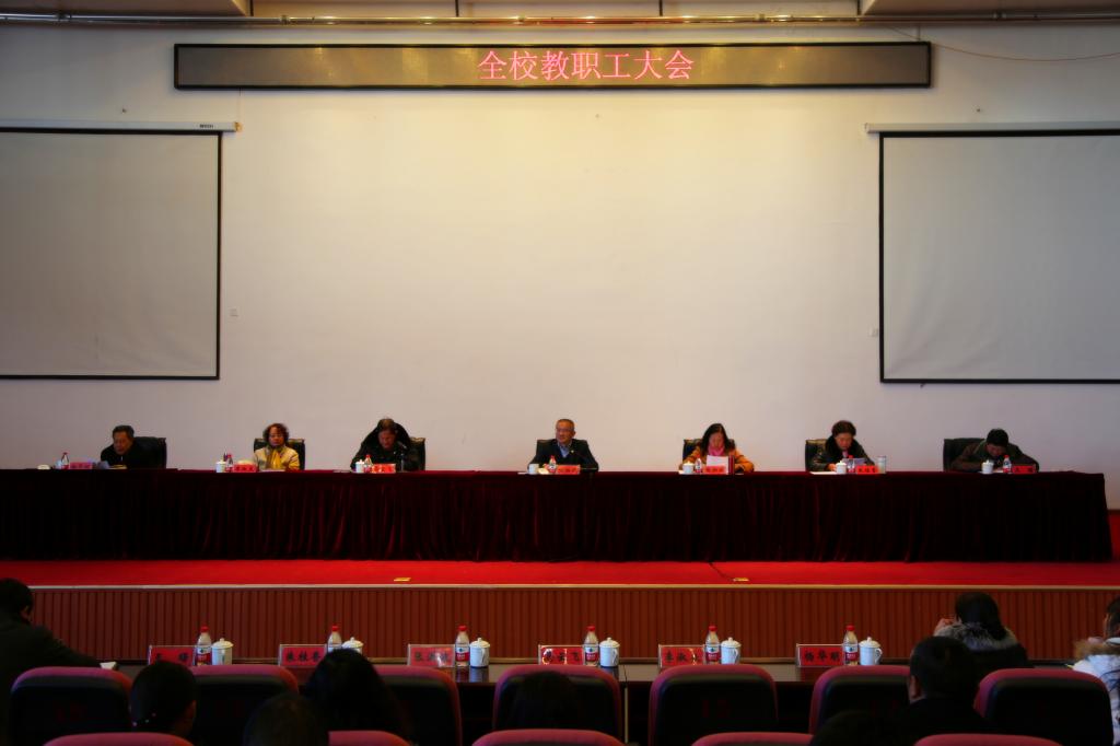 1月11月下午14:00时,我校在图书馆报告厅召开全校教职工大会,全校教职员工参加了会议。第一阶段,会议表彰了我校获省政府特殊津贴人员、2018年科研工作先进个人,为职称晋升教师颁发聘书,校长张洪波作2018年工作总结。第二阶段,党委书记张祖武作学习贯彻全国教育大会精神形势政策报告会。会议由党委副书记马云飞主持。