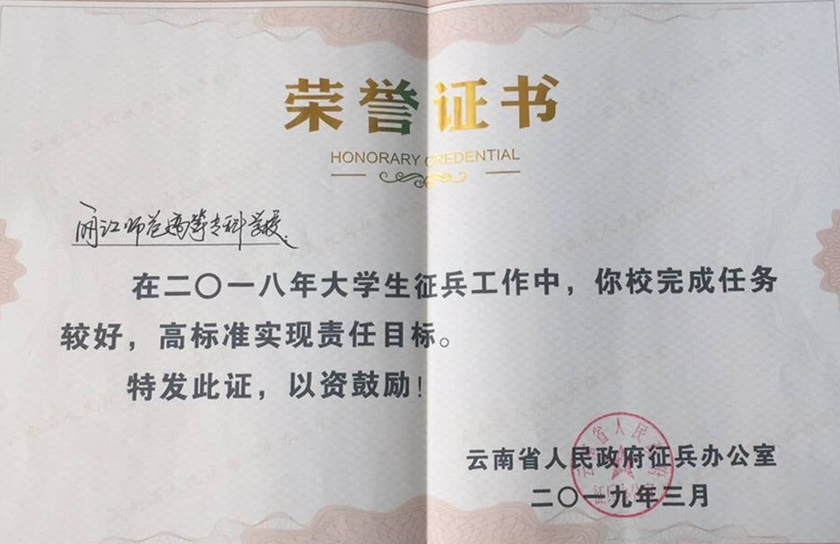2019年3月28日,云南省人民政府征兵办公室召开云南省大学生征兵工作业务培训会议,会上,我校因2018年征兵工作成绩突出,喜获表彰奖励。