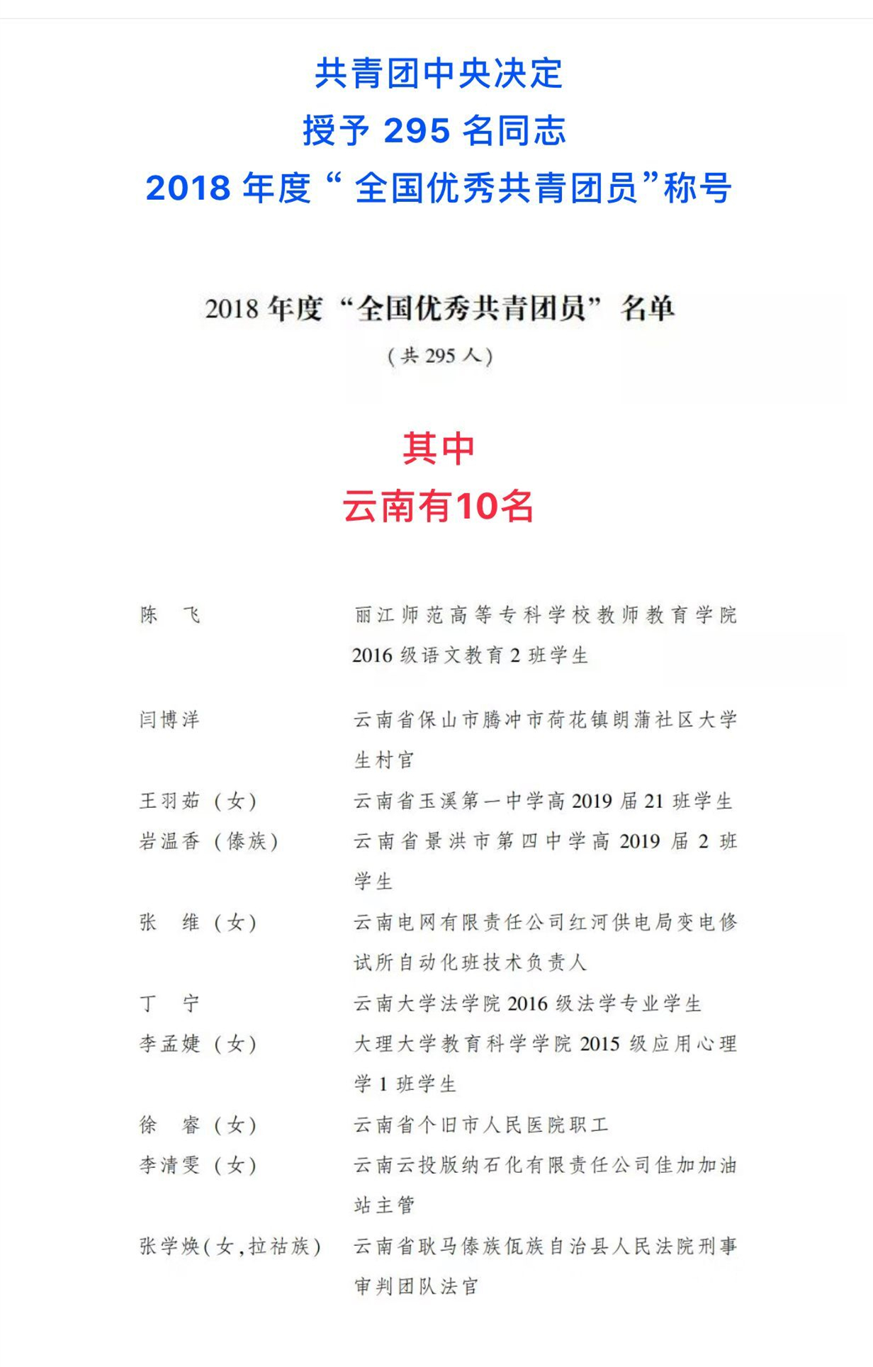 2019年5月4日,“五四青年节”,共青团中央发布关于表彰2018年度“全国优秀共青团员”“全国优秀共青团干部”“全国五四红旗团委(团支部)”的决定,我校教师教育学院2016级语文教育2班陈飞同学荣获2018年度“全国优秀共青团员”称号。