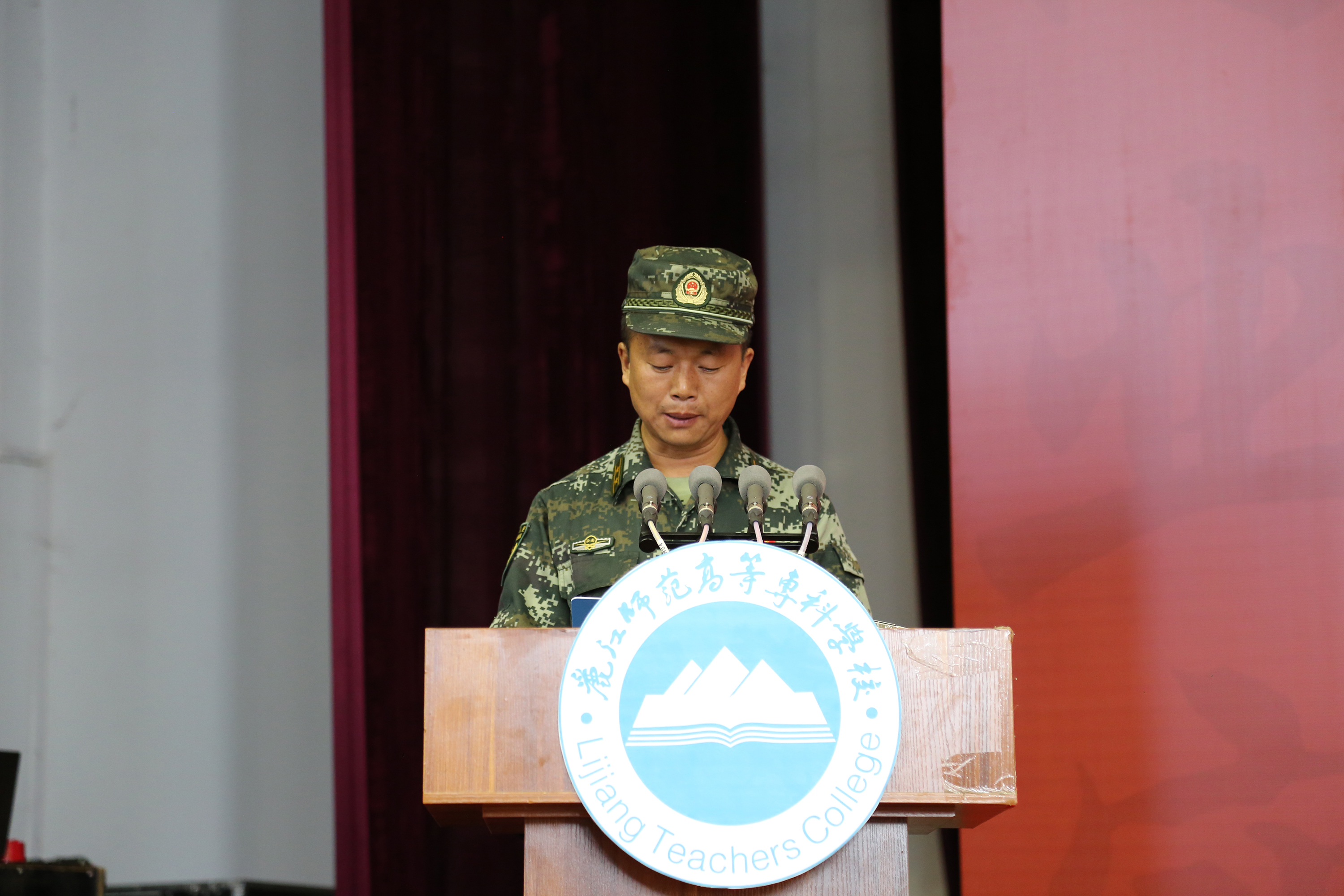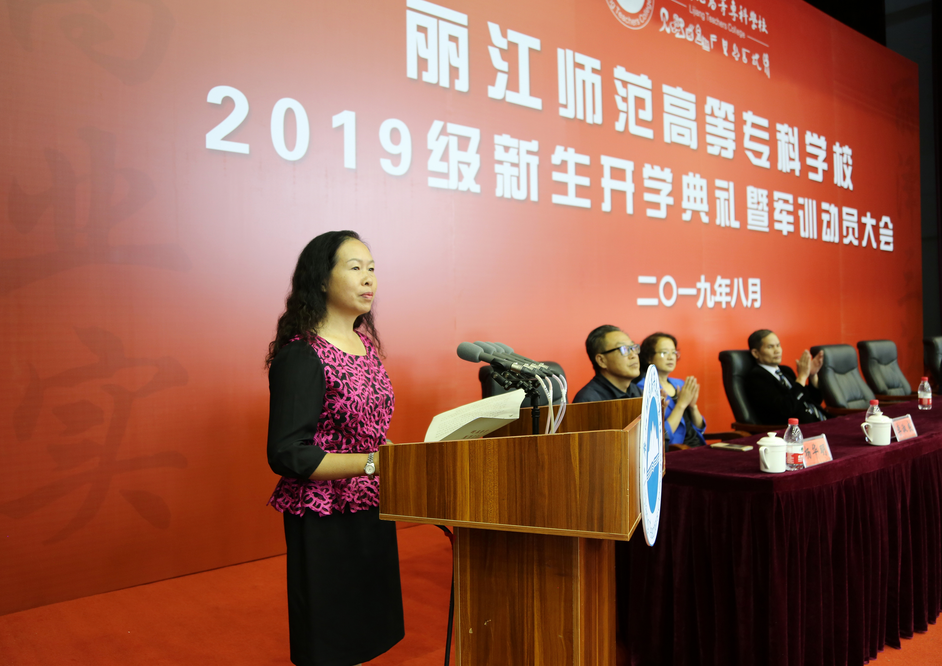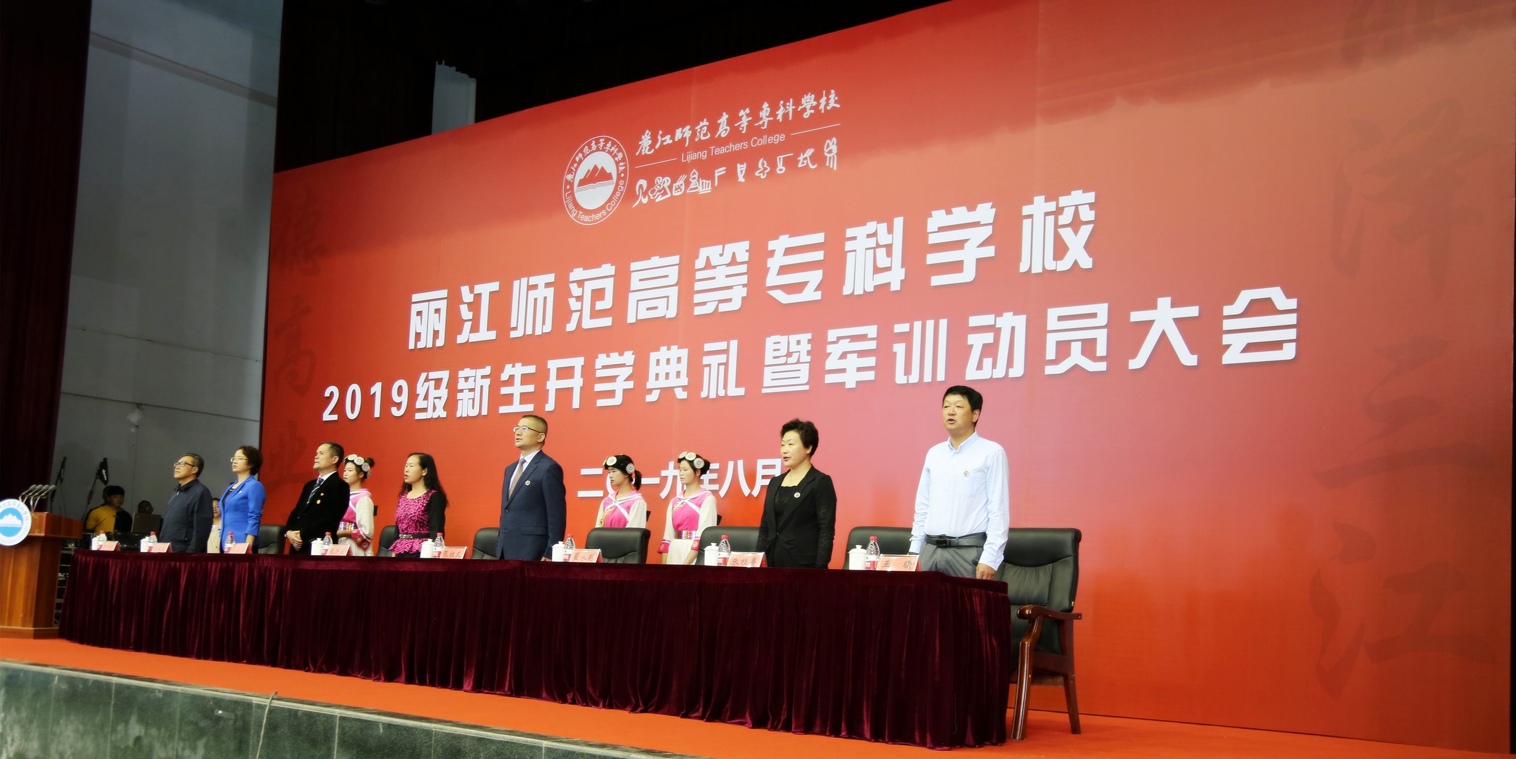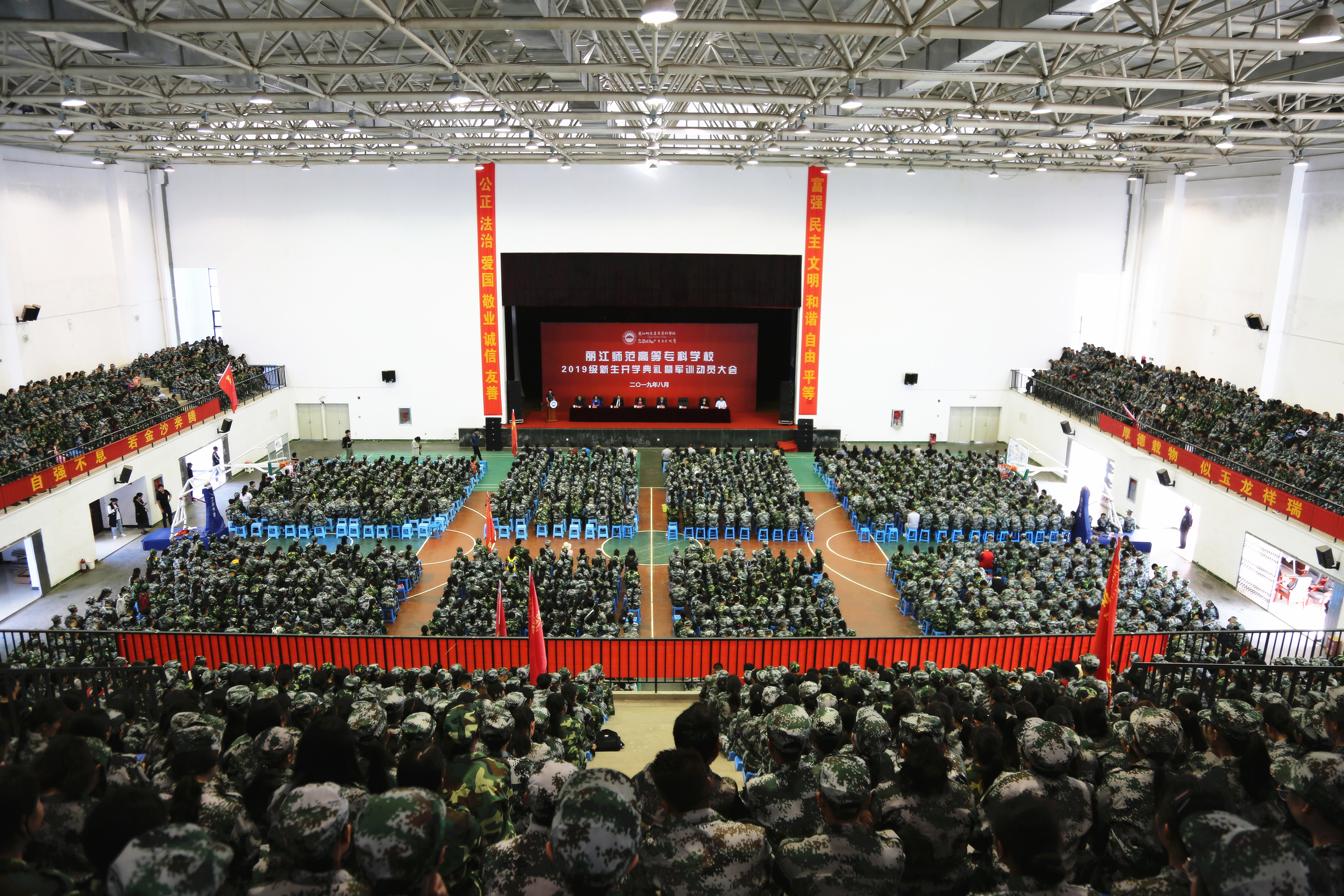 2019年8月26日上午9时,丽江师范高等专科学校2019级新生开学典礼暨军训动员大会在体育馆举行。学校党委书记张祖武、校长张洪波、党委副书记马云飞、副校长朱桂香、纪委书记李淑良、党委委员王曙,杨华明同志出席典礼。各学院科以上干部、各部门负责人、学生处、教务处、校团委全体工作人员、新生辅导员(班主任)以及2019级3000余名新生参加典礼。