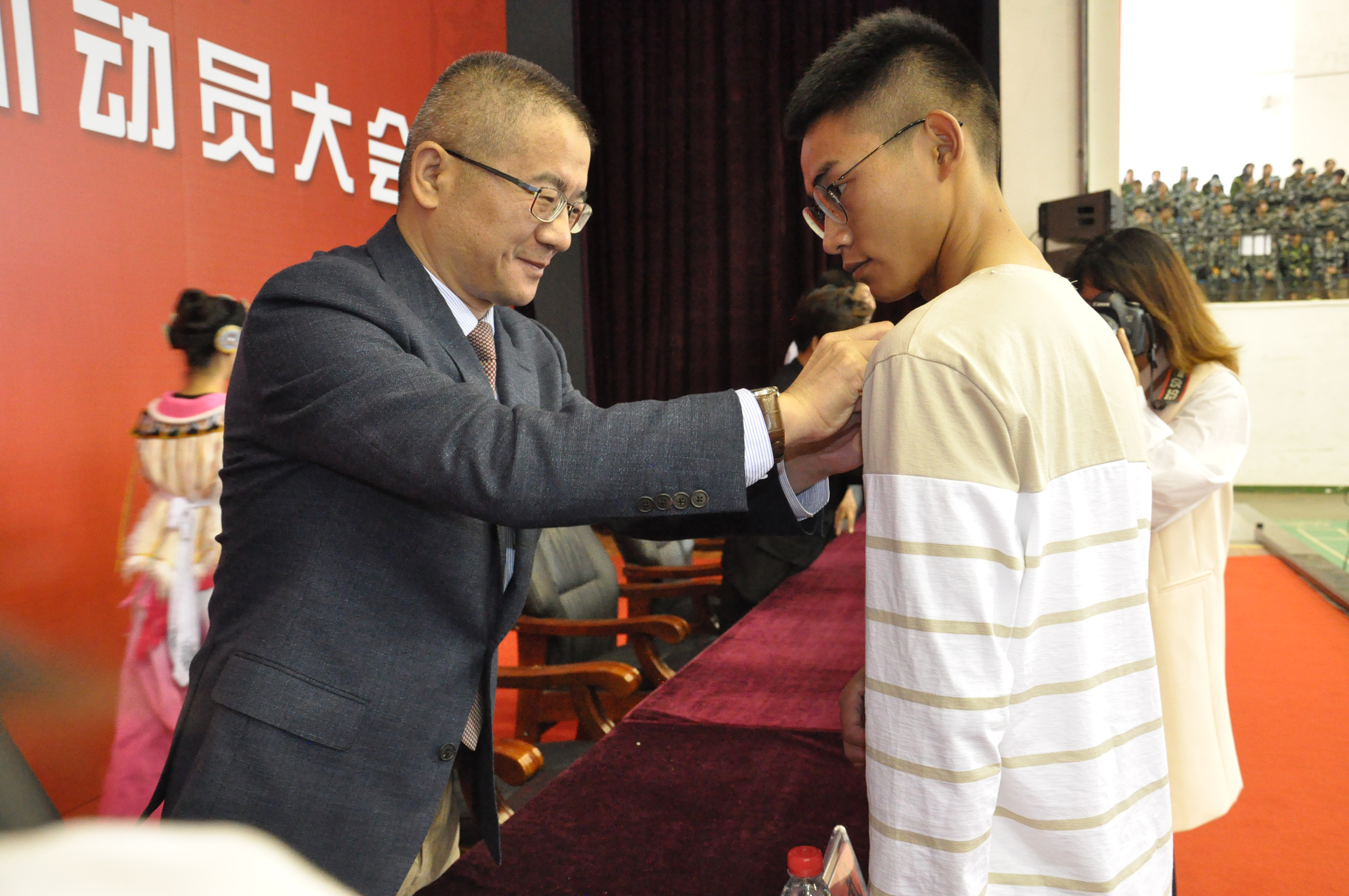 主席台就坐的校领导为2019级新生代表佩戴校徽,戴上校徽的时刻,他们的脸上都洋溢着激动与喜悦。