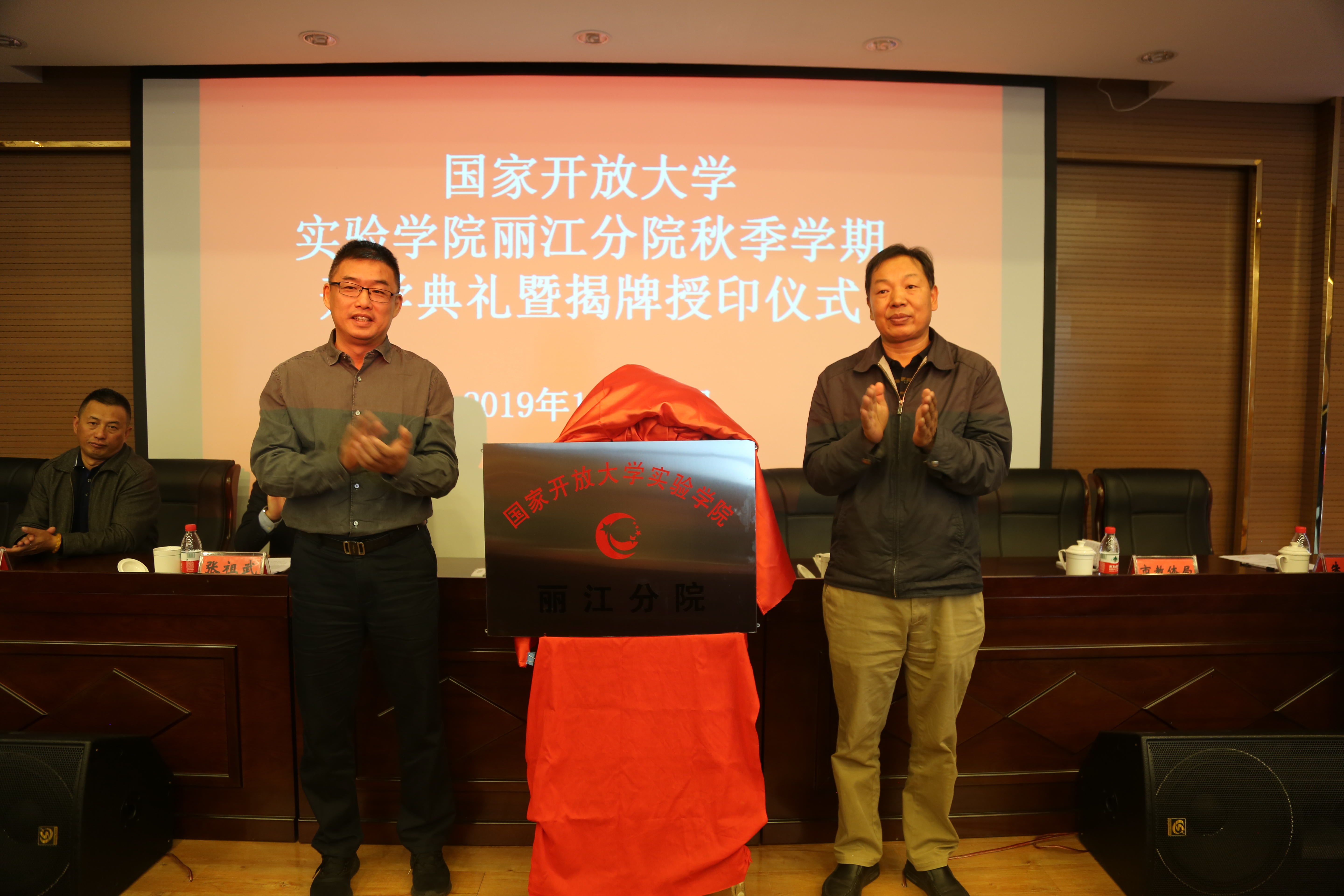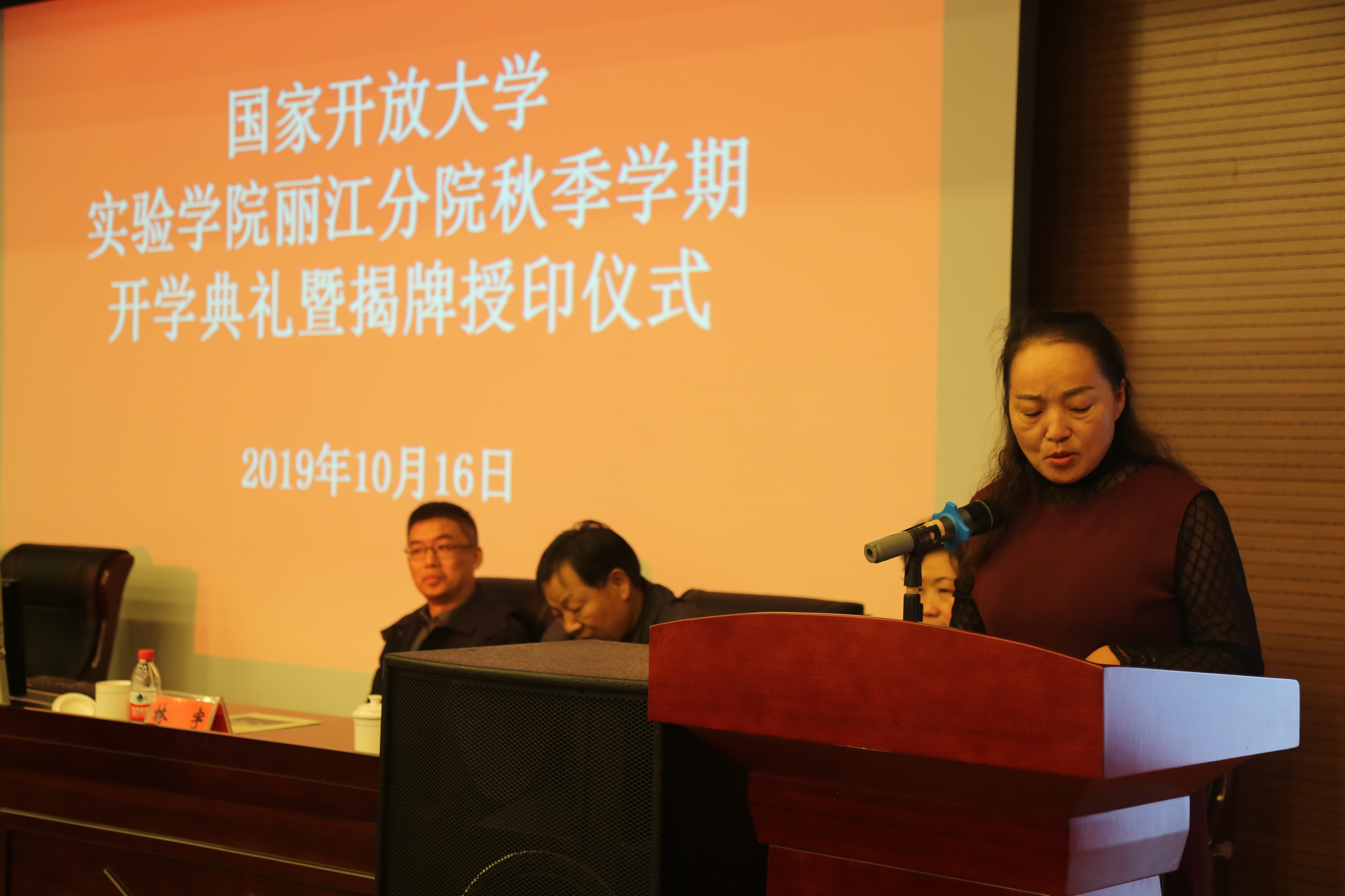 10月16日,国家开放大学实验学院丽江分院在我校实训楼318举行2019年秋季新学期开学典礼暨揭牌授印仪式。国家开放大学副校长林宇、丽江市教育体育局副局长洪向泉、迪庆民族中专校长张建文、丽江师范高等专科学校党委书记张祖武,丽江师范高等专科学校副校长、实验学院丽江分院院长朱桂香等出席活动。由朱桂香主持仪式。