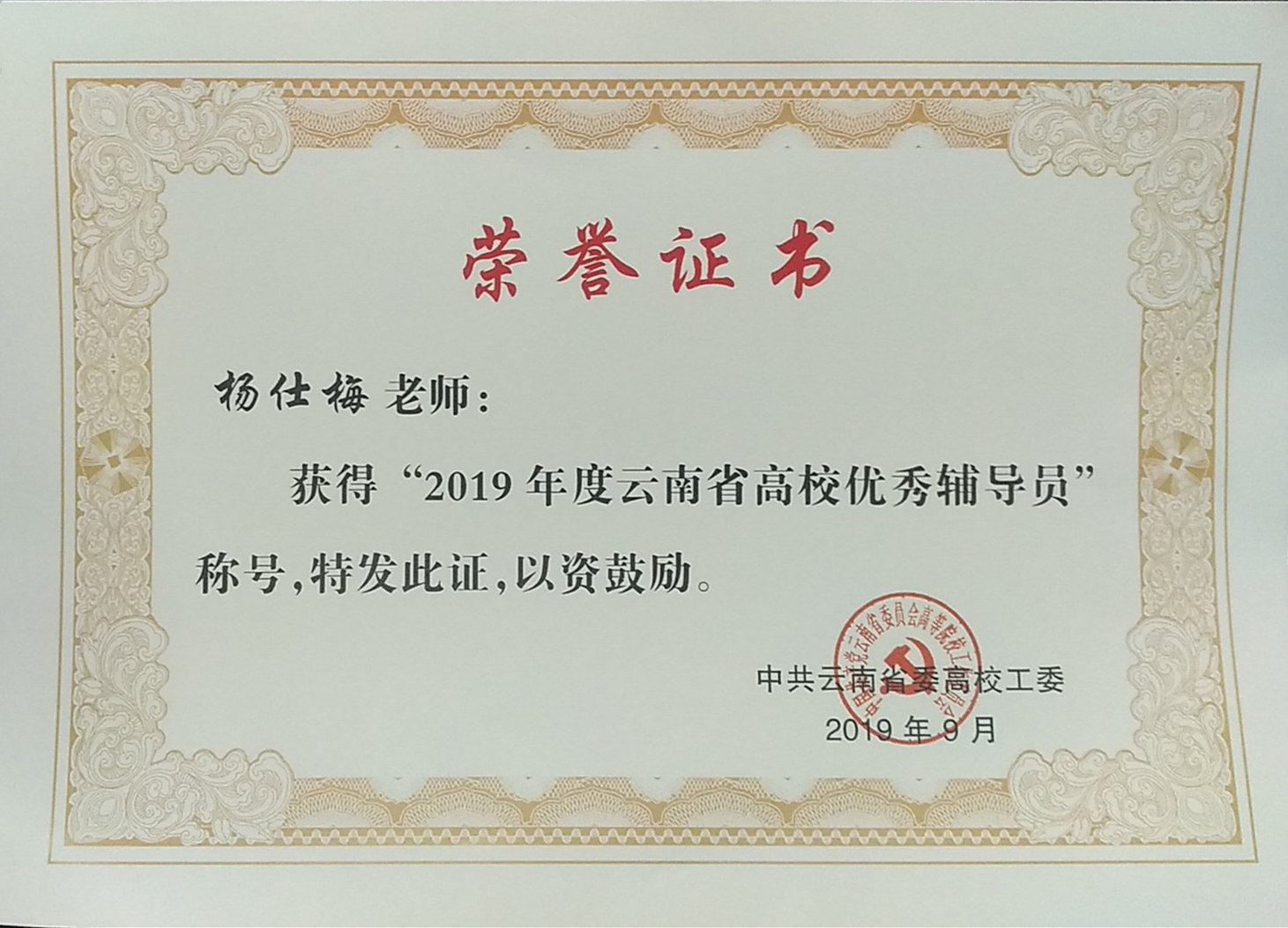 近日,中共云南省委高校工委发布《关于表彰2019年云南省高校优秀辅导员和班主任的通知》文件,我校大学生思想政治辅导员杨仕梅获“2019年度云南省高校优秀辅导员”荣誉称号。