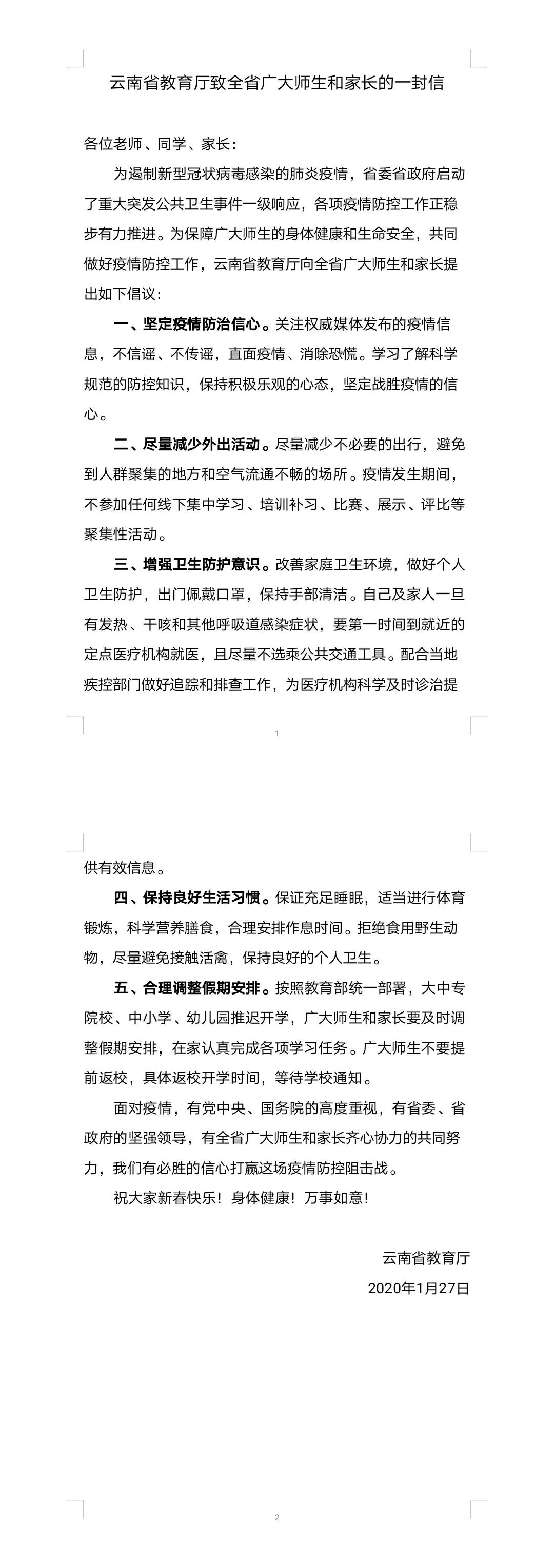 云南省教育厅致全省广大师生和家长的一封信