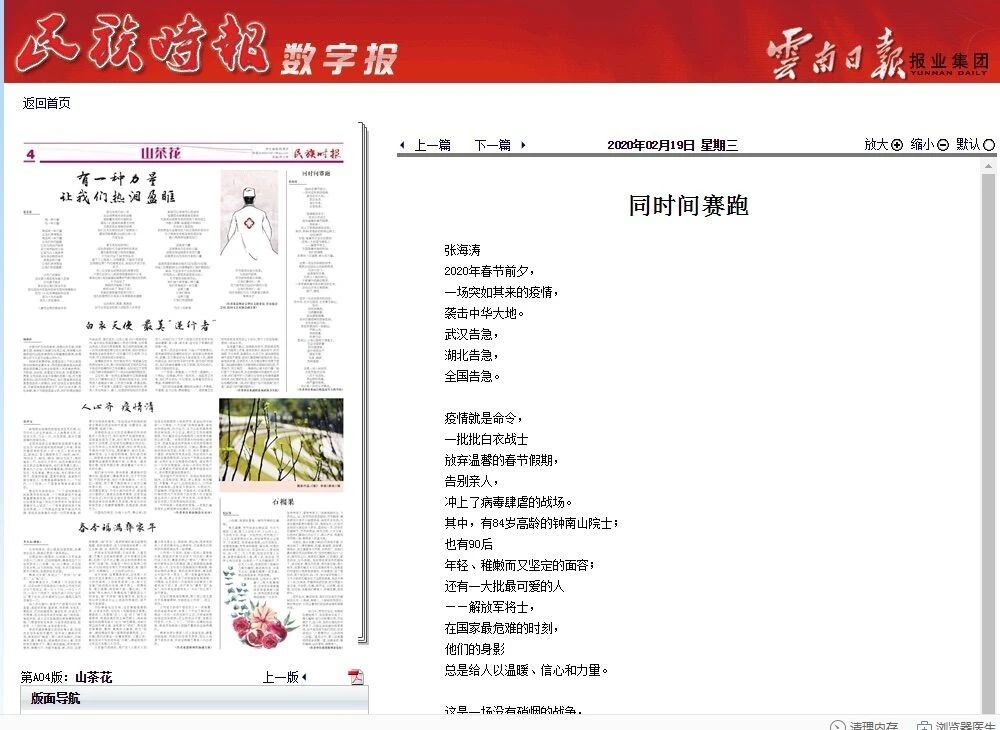 2月19日,我校教师教育学院张海涛副教授在《民族时报》(数字报)上发表诗歌《同时间赛跑》,讴歌奋战在抗“疫”一线的工作人员,歌颂祖国在疫情面前同时间赛跑、与病魔较量、坚决打赢疫情防控阻击战的勇气和决心。