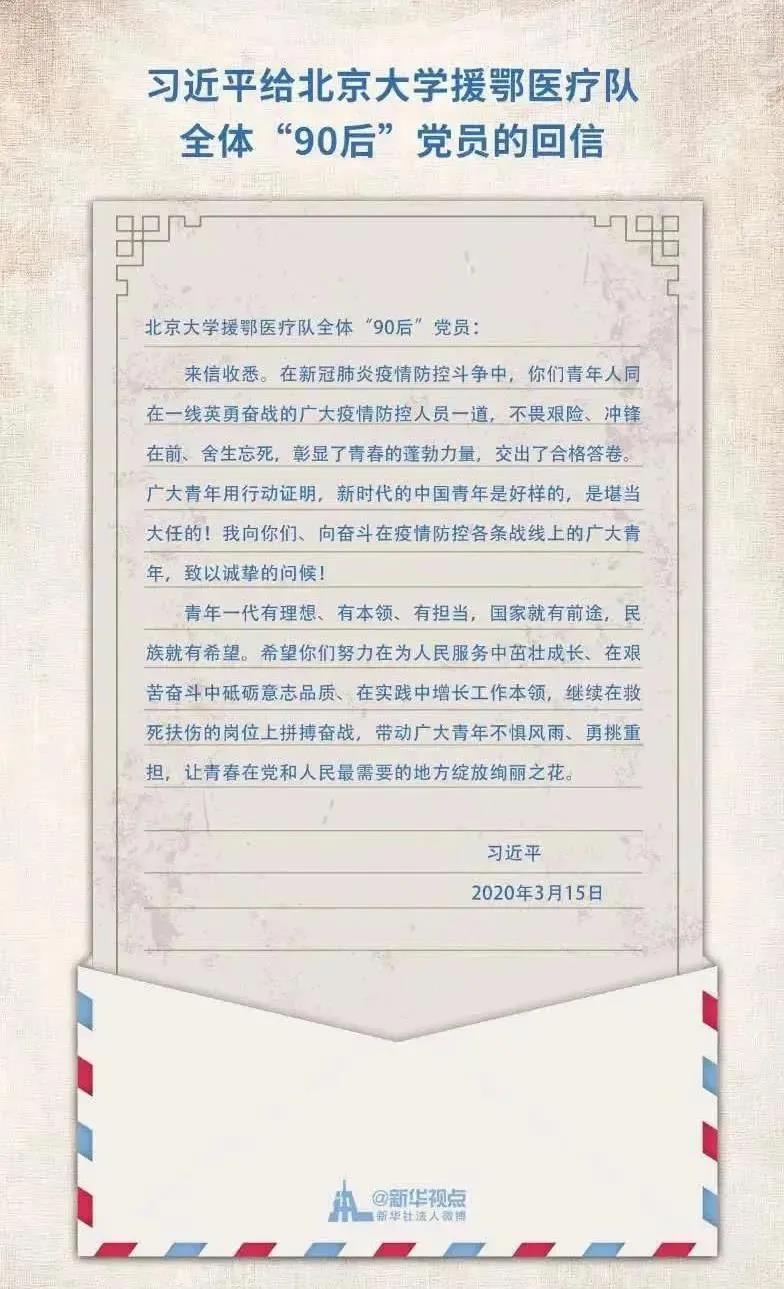 3月15日,习近平总书记给北京大学援鄂医疗队“90后”党员回信,向他们和奋斗在疫情防控各条战线上的广大青年致以诚挚的问候,勉励广大青年不惧风雨、勇挑重担,让青春在党和人民最需要的地方绽放绚丽之花。习近平总书记的深情寄语和殷切嘱托,激励着各条战线上的广大青年人,为打赢疫情防控阻击战继续奋战、再立新功,为党和人民的事业做出新时代青年的贡献。