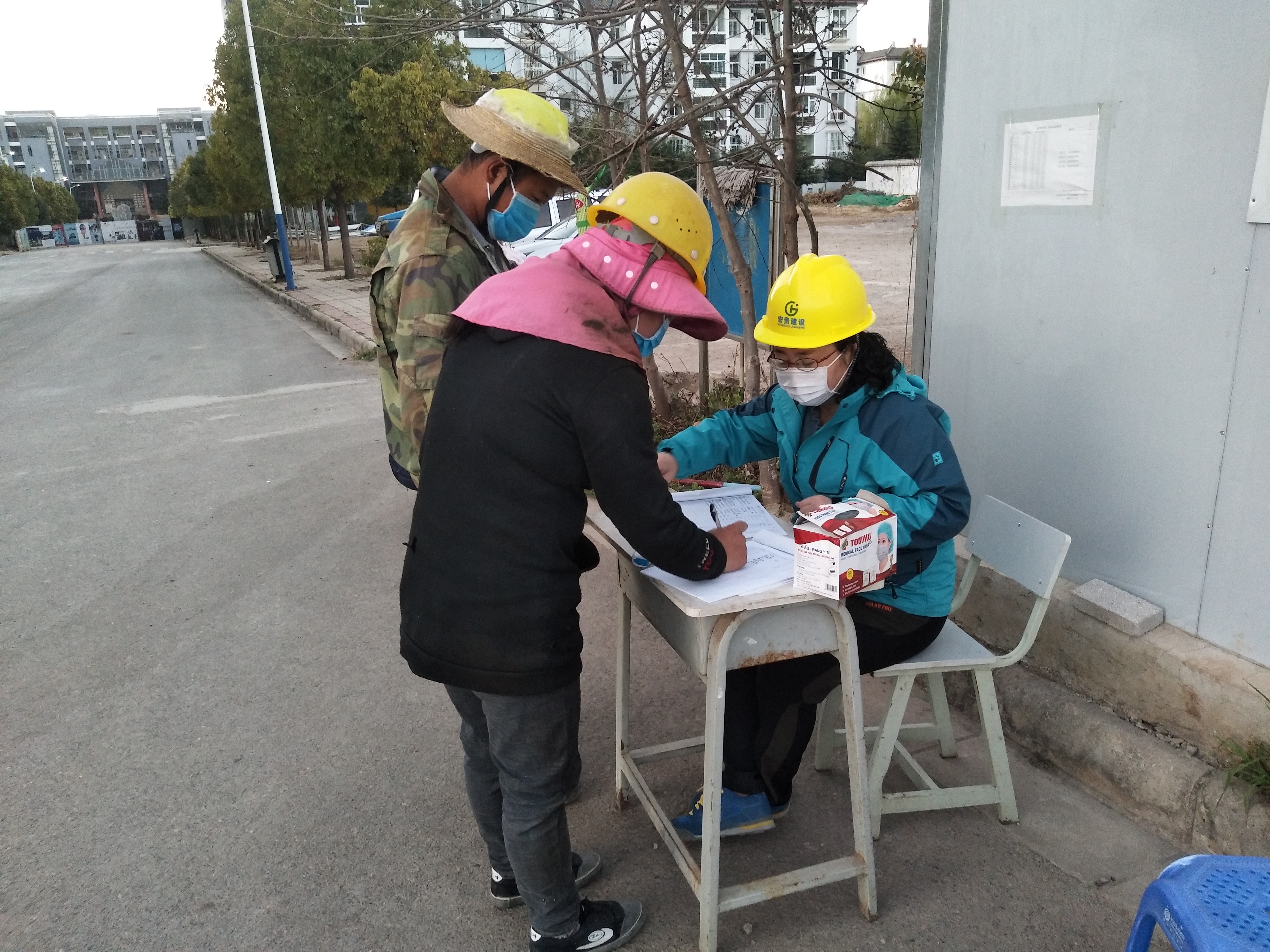 在项目的入口处,项目管理人员、工人或者访客要先扫描云南健康码,证明个人行动轨迹,再扫进场二维码,填写工地出入人员登记表;使用体温仪测量体温,戴好安全帽,佩戴发放当天使用口罩等,才能正式进入工地。在建筑工地大门前显著位置悬挂着疫情防控期间特有的安全警示标语,在建设项目有序复工的同时,防疫工作仍是重中之重。