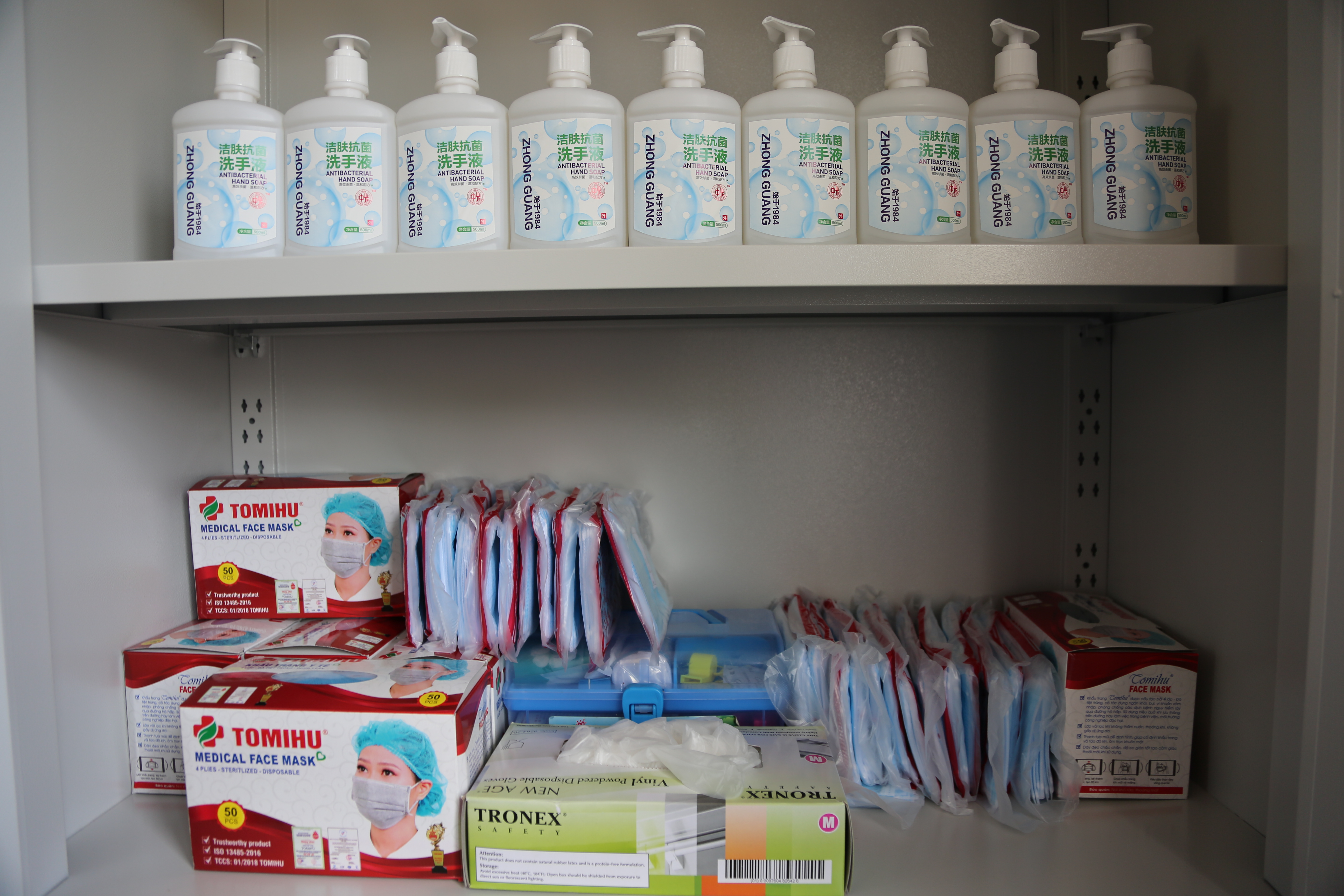 在疫情防控办公室内,口罩、洗手液、防护服、消毒液等防疫物资准备齐全,完全满足员工需求。项目公司每天专人定时消毒,对办公区、休息区、工程入口处等场所进行每天不少于两次的清洁消毒,避免交叉感染,确保工地环境干净整洁。