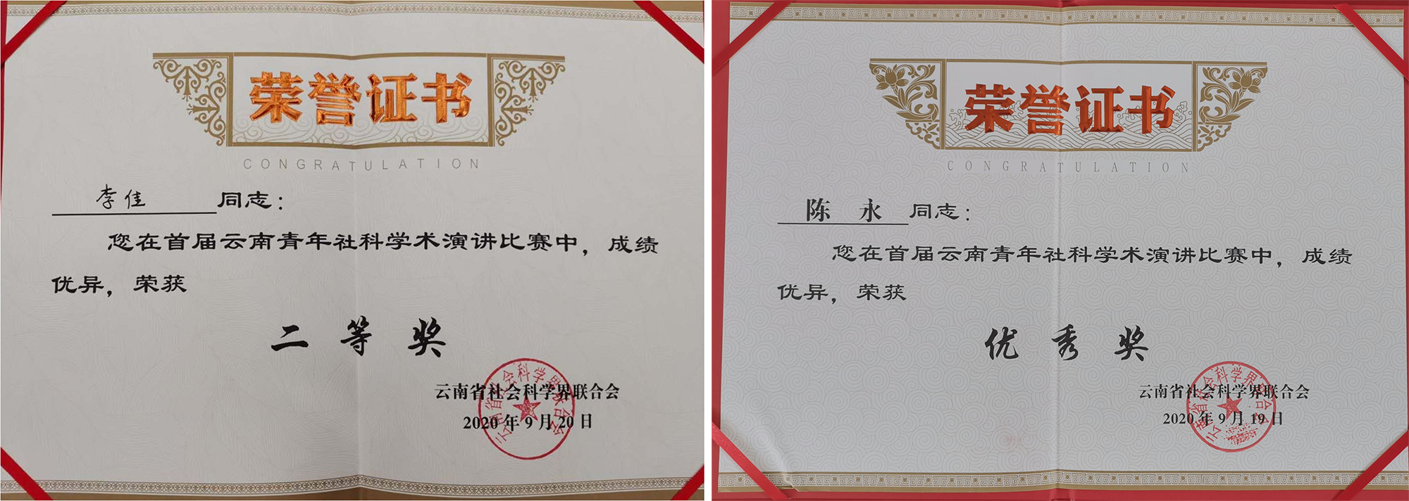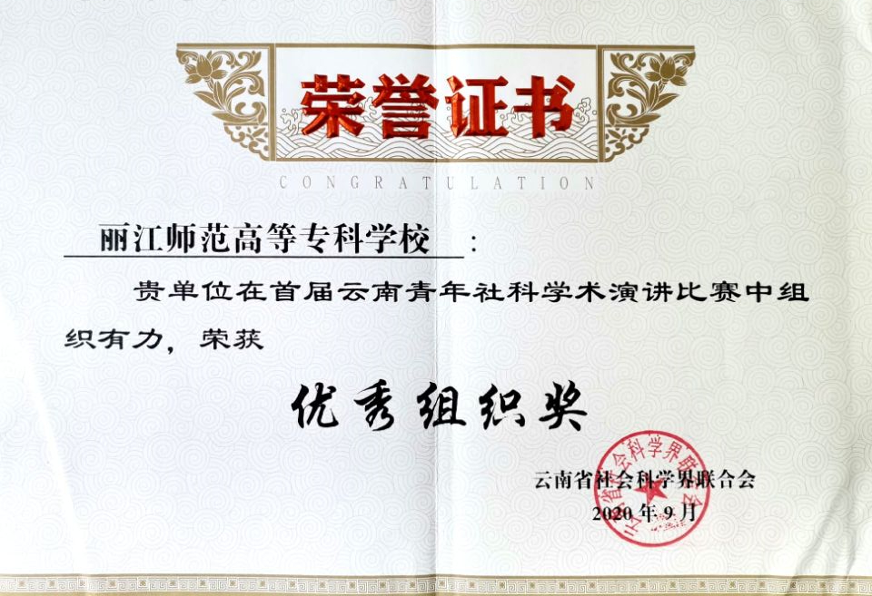我校教师教育学院青年教师李佳在云南省社科联主办的首届云南青年社科学术演讲比赛中荣获“二等奖”,国际文化交流学院青年教师陈永荣获“优秀奖”,丽江师范高等专科学校荣获“优秀组织奖”。