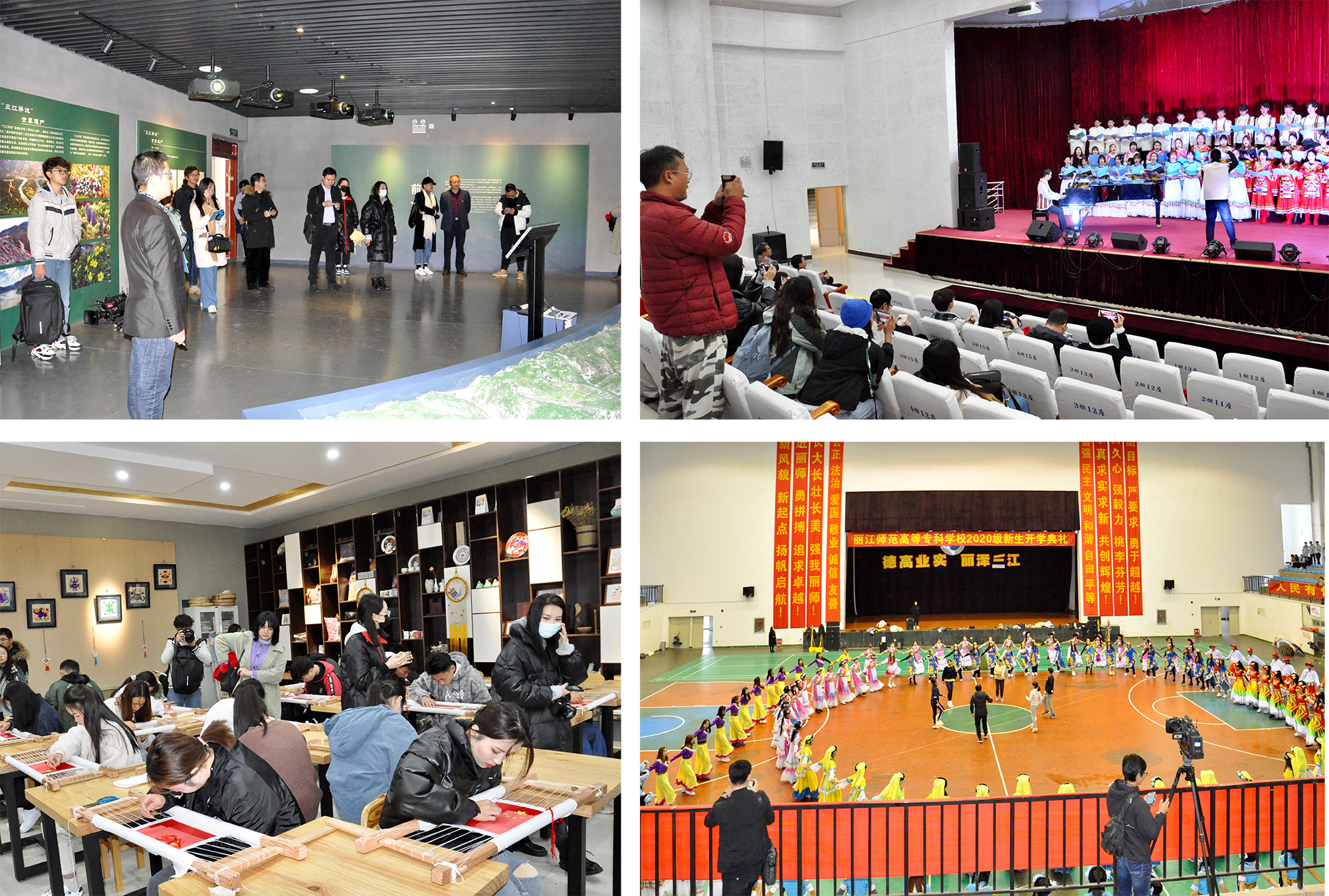 在学校党委书记张祖武、党委副书记彭鸿昌的陪同下媒体团一行实地走访了丽江师专民族团结进步示范馆、高山植物标本馆、滇西北民族艺术传承基地、民族文化宣讲实训室,观看了学校的特色课间操——民族打跳,欣赏了由我校禾雨老师创作的歌曲合唱《北京有个金太阳》以及《团结花开丽江美》。