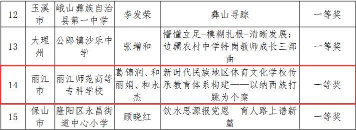 近日,云南省教育厅、云南省民族宗教事务委员会通报了云南省第四届“学校民族团结进步教育读书活动”获奖结果,我校教师葛锦润、和丽娟、和永杰申报的《新时代民族地区体育文化学校传承教育体系构建——以纳西族打跳为个案》获民族团结进步征文(教师组)一等奖。