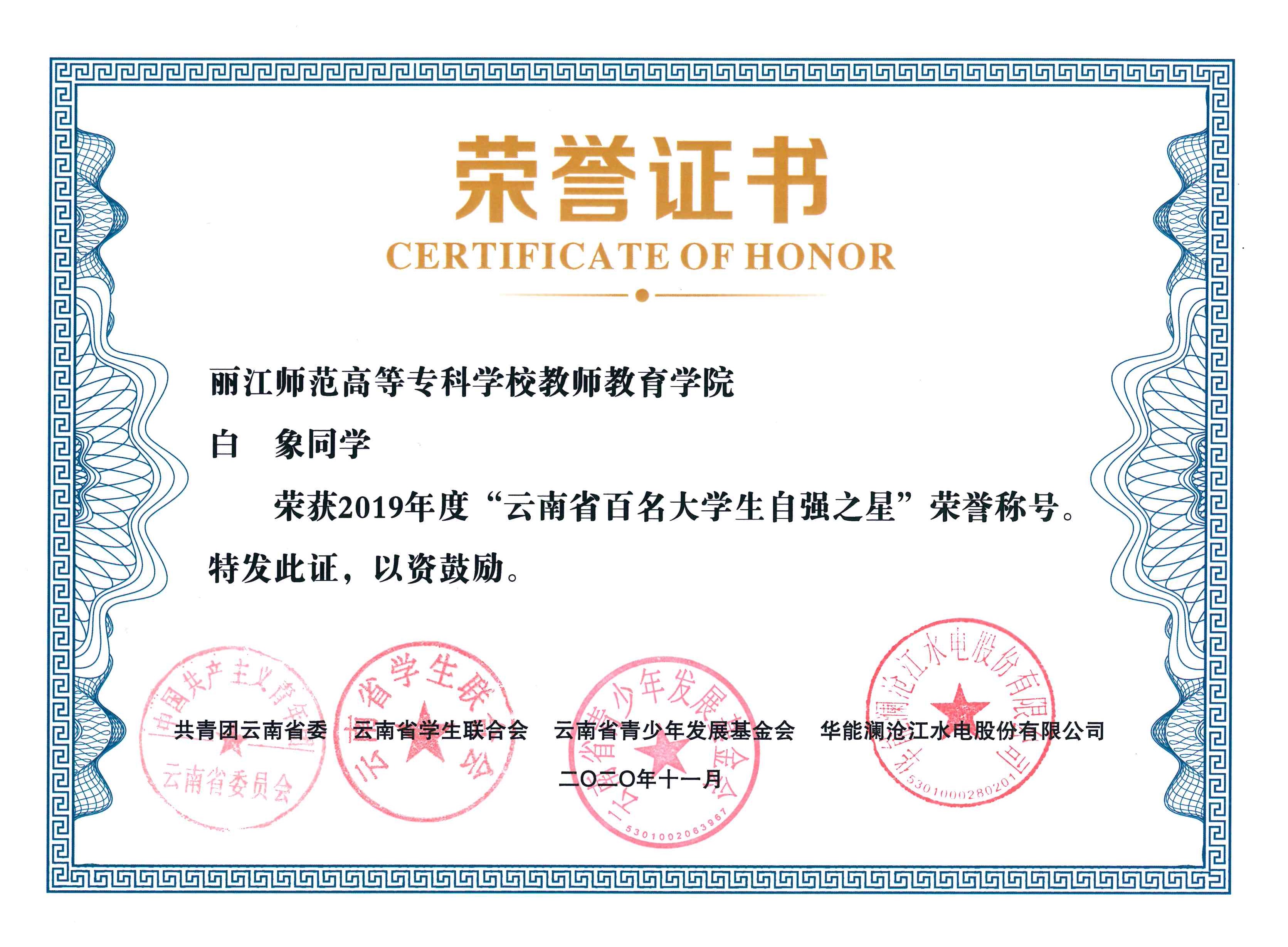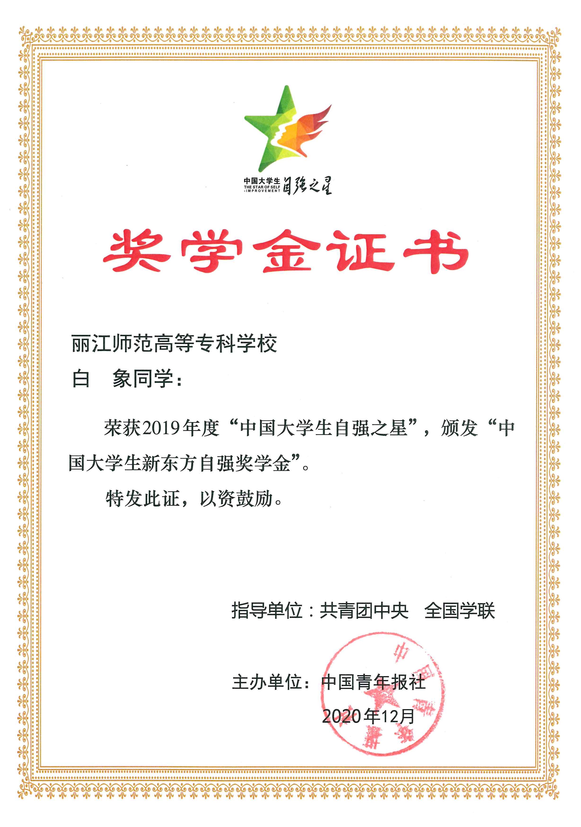 在由共青团中央、全国学联指导,中国青年报社、新东方教育科技集团联合开展的2019年度“中国大学生自强之星”奖学金评定活动中,我校2018级语文教育二班白象同学荣获“中国大学生自强之星”和2019年度“云南省百名大学生自强之星”奖学金。