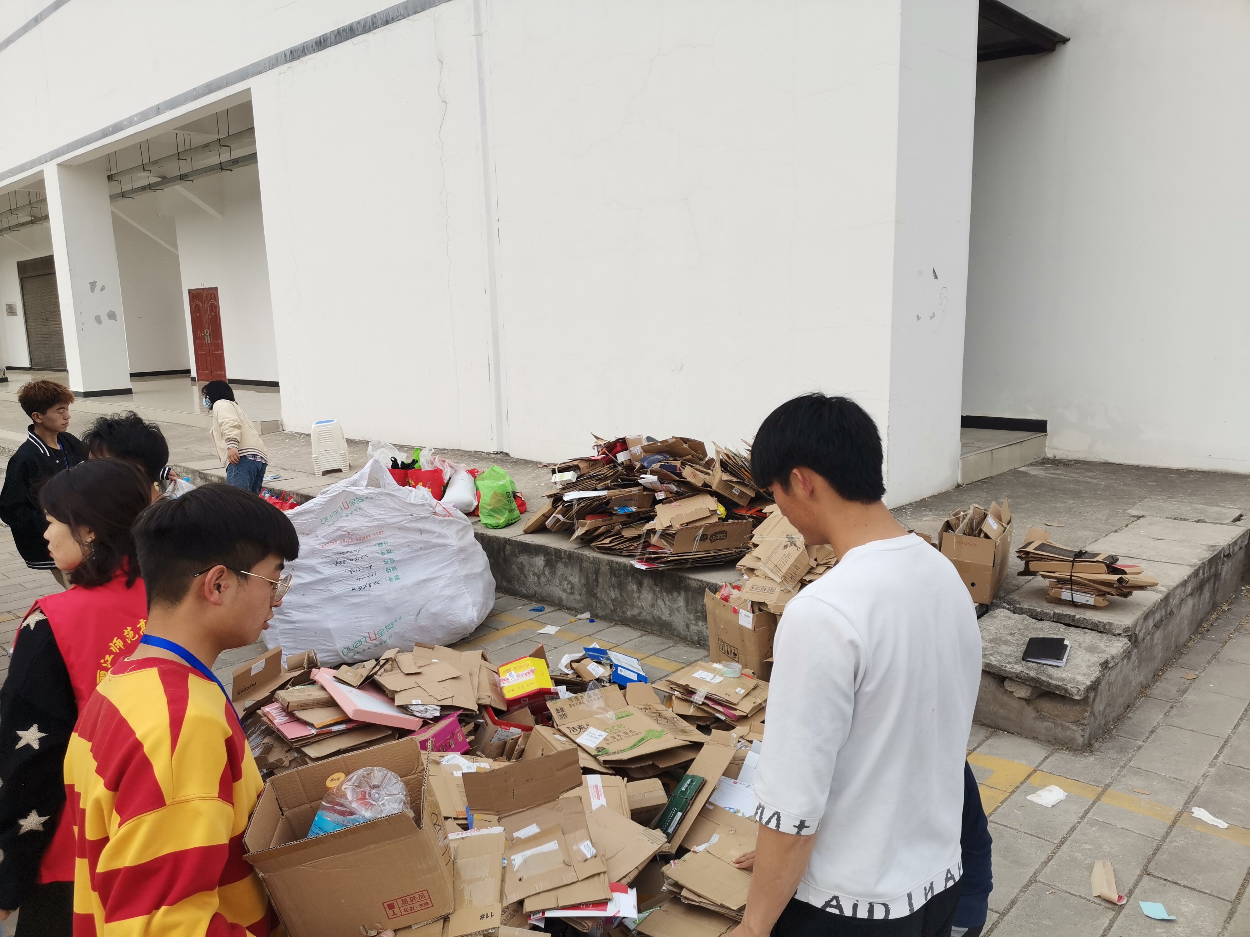 活动当天,同学们把存了好久的纸箱和水瓶捐献出来,正所谓“众人拾柴火焰高”,不到一个小时,体育馆东门就堆起了一座“小山”。身着志愿者服装的组织者,把回收来的废品分类摆放。下午三点,当最后一波捐赠纸箱的同学们走完,志愿者们和校外废品收购站老板讨价还价、争论不休,只为把纸箱价格提升一些,多购买几本书籍。