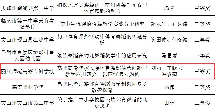 近日,云南省教育厅下发《云南省教育厅关于组织开展云南省学校民族团结进步系列活动民族体育舞蹈线上教学和竞赛活动的通知》文件,我校积极参加。刘丽、王晗云、许俊菊的《高职高专院校民族体育舞蹈传承创新与教学应用研究--以丽江师专为例》获得三等奖。