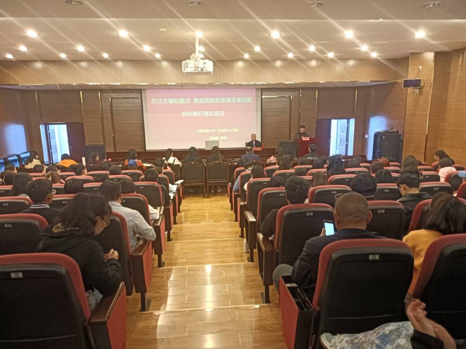 为落实2022年4月20日校领导到马克思主义学院(以下简称“马院”)召开现场办公会的会议精神,在“强院兴校”中打造“一院一品”,进一步落实思想政治理论课建设相关工作,4月22日上午,马院诚邀中央马克思主义理论研究和建设工程首席专家、云南民族大学马克思主义学院张建国教授到我校开展“抓住重点和关键,推进高校思政课改革创新”和“如何做好理论宣讲”主题讲座,讲座在实训楼318报告厅举行,马院无课教师和学生代表参加了讲座,讲座由马院副院长寸玉海主持。