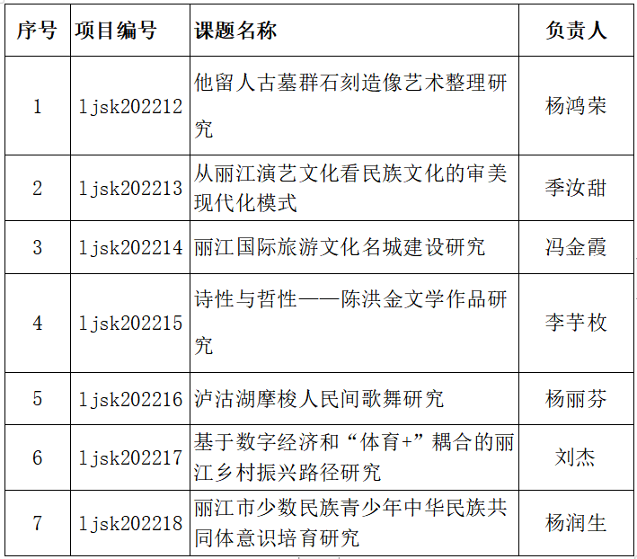 近日,收到《丽江市社科联关于2022年度丽江市哲学社会科学课题立项的通知》,我校共计立项7项(具体立项名单见下表),本次丽江市哲学社会科学课题全市共计申报57项,立项20项。其中,我校申报18项,立项7项。