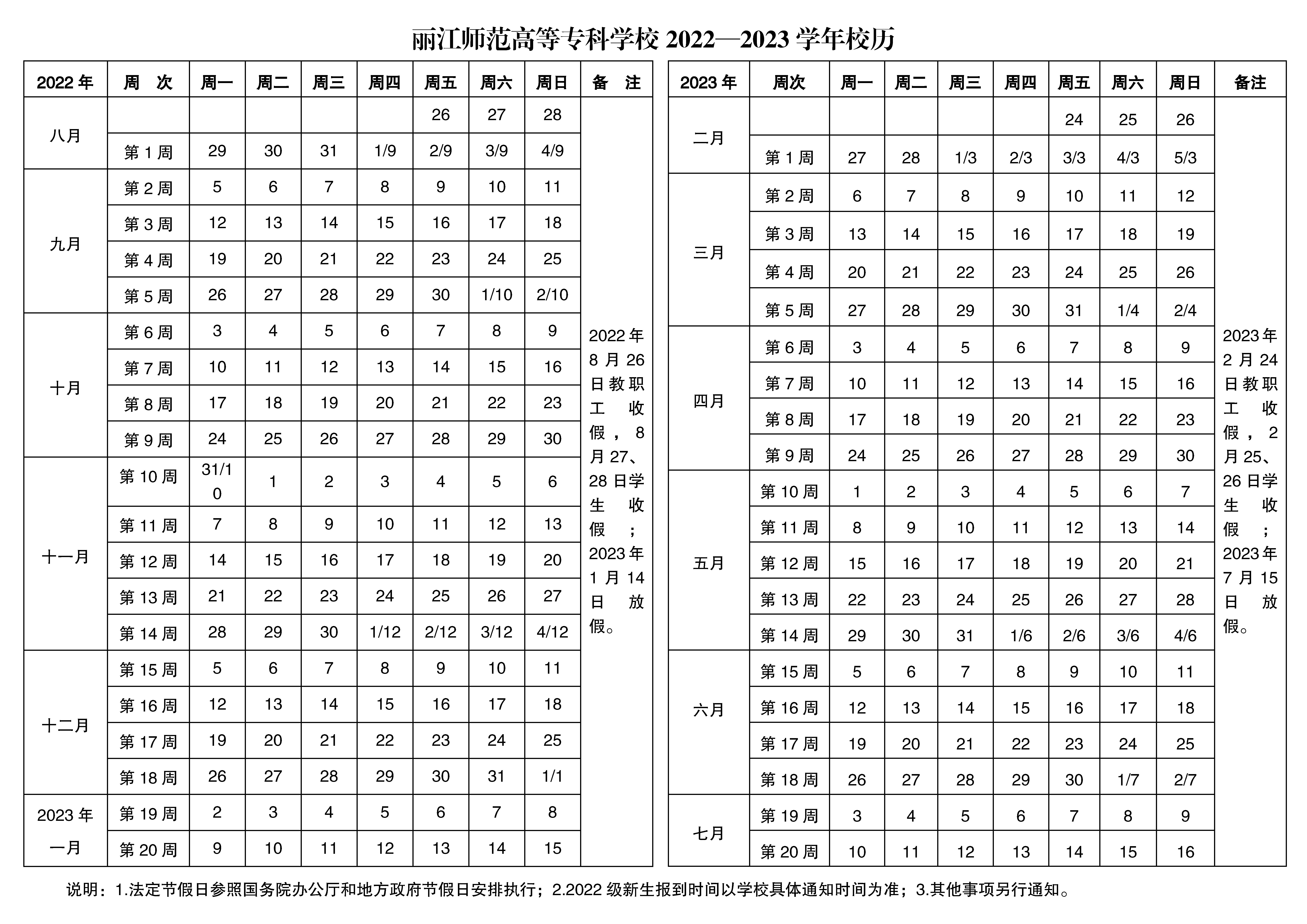 丽江师范高等专科学校2022—2023学年校历