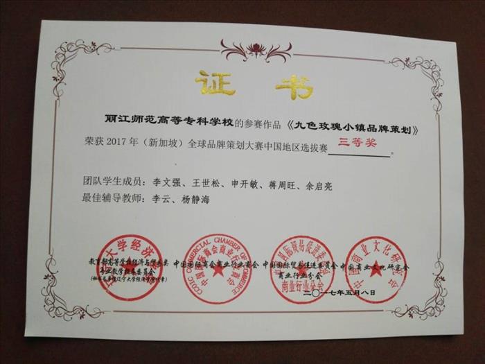 (新加坡)全球品牌策划大赛中国地区选拔赛已有5年的发展历程,起源于2013年由中国贸促会商业行业分会牵头主办的全国高校商业精英挑战赛品牌策划竞赛,是目前我国品牌建设领域唯一的国家级、国际性的专业赛事活动,也是基于校企合作,服务企业品牌建设的创新实践平台。此次竞赛共有来自北京、天津、上海、重庆、等23个省、直辖市和自治区的116所高等院校的300多支参赛队报名参赛,参与师生人数近2000人。最终,经过激烈角逐,丽江师专代表队的参赛作品《九色玫瑰小镇品牌策划》以其新颖的构思和周密的论证获得了专家评委的一致认可,荣获2017年(新加坡)全球品牌策划大赛中国地区选拔赛三等奖的殊荣。为我系2017年职教活动周的开展取得了优异的成果。