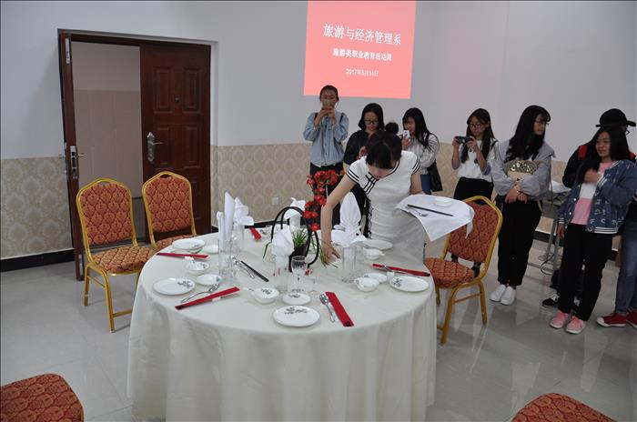 为进一步落实旅游与经济管理系关于开展2017年职教活动周的方案,同时也为了让大一新生在观摩中认真学习酒店管理方面的实操技能。2017年5月11日,在学校实训楼205酒店管理实训室旅游与经济管理系举办了旅游与经济管理系举行中餐摆台及调酒技能观摩活动。本次活动由旅游与经济管理系李娟教师全程指导,系副主任和燕杰、学生科长朱道平等老师参加了本次活动。