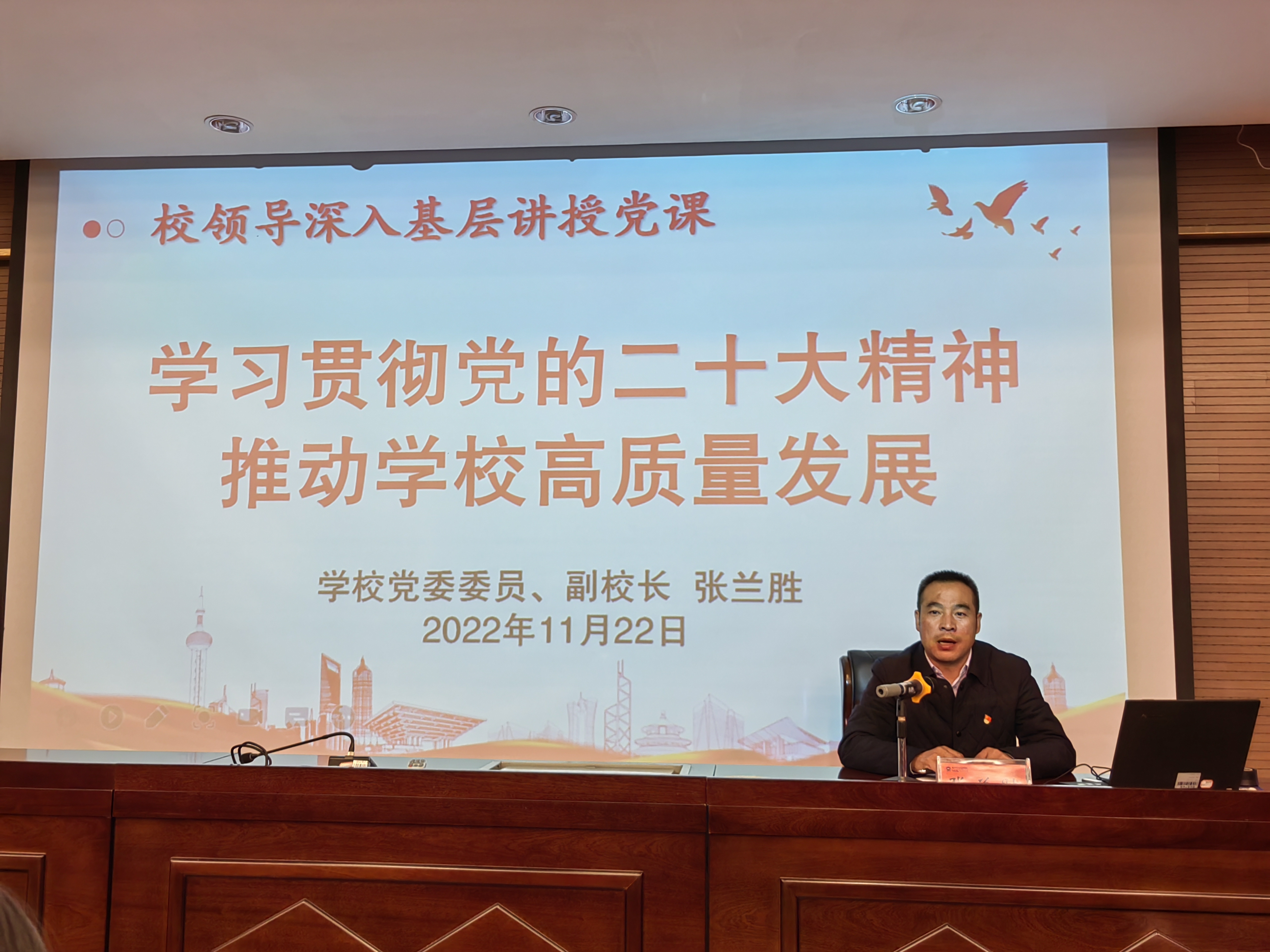 张兰胜以“学习贯彻党的二十大精神,推动学校高质量发展”为主题进行讲授。他分别从“充分认识学习贯彻党的二十大精神的重大意义”“全面准确学习领会党的二十大精神”“坚持知行合一,贯彻落实好党的二十大作出的重大决策部署,推动学校高质量发展”三个方面进行宣讲。