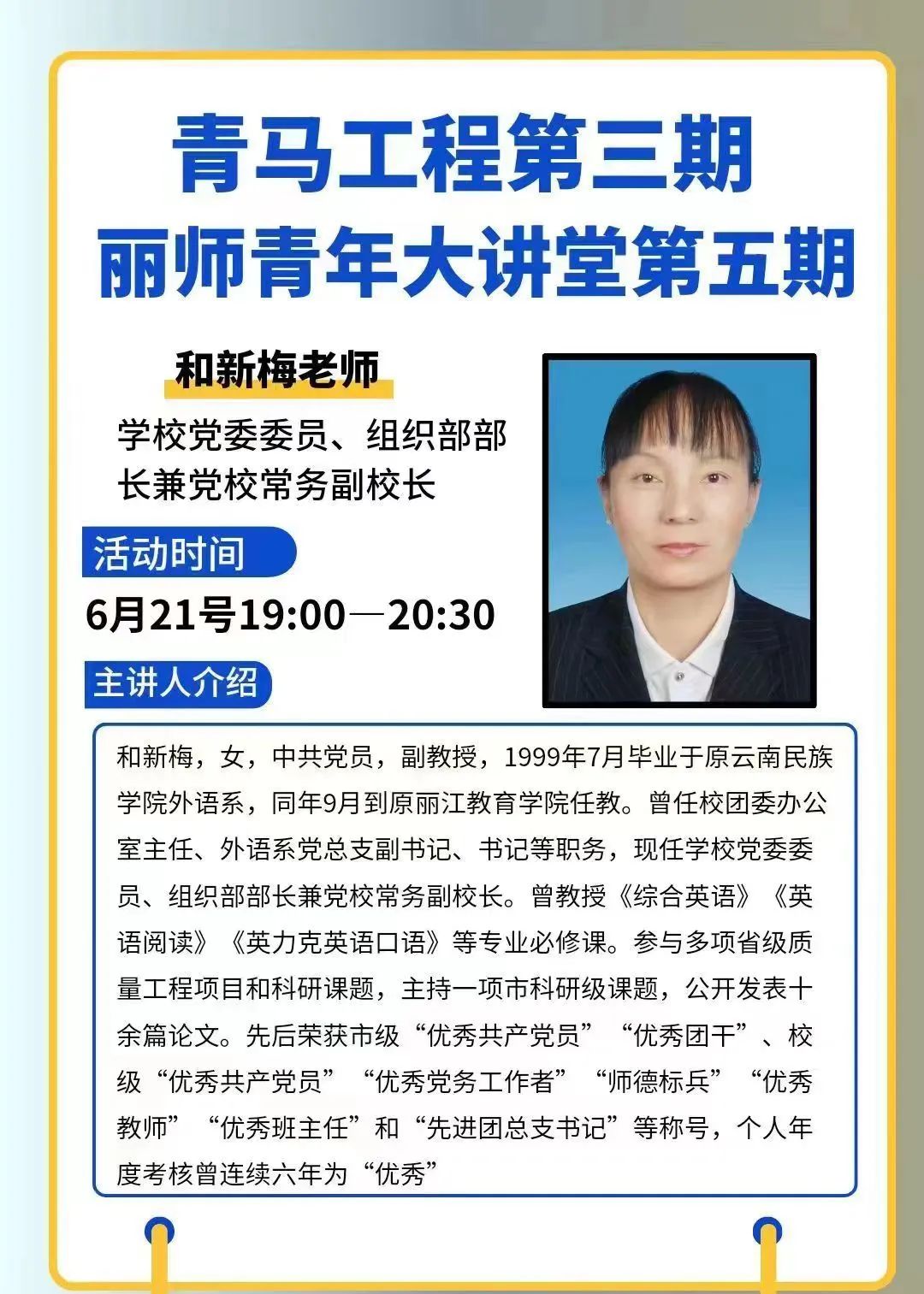 6月21日,由校团委、科技处主办,校团委组织部、广播站承办的2024年青马工程培训第三期暨丽师青年大讲坛第五期在求是楼318举行。本次培训的主题是“新时代青年在中国式现代化,新征程中的使命与担当”特邀外国语学院副教授,校党委委员、组织部部长兼党校常务副校长和新梅老师担任主讲人,各学院团学干部代表、2024年新发展团员共计130余名学生参加。