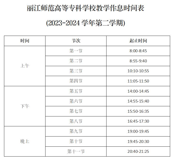 丽江师范高等专科学校教学作息时间表(2023-2024学年第二学期)